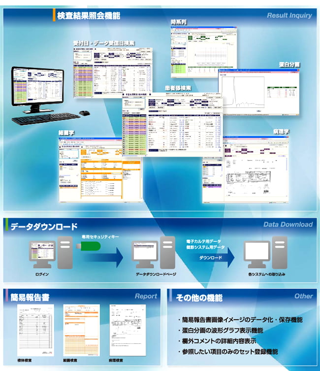 WEBRISとはインターネットを利用した検査結果照会システムです。専用セキュリティーキーでアクセスすることで時間と場所を選ばずにご利用可能です。検査結果照会機能、簡易報告書印刷機能、データダウンロード機能等、様々な機能をご提供し、診察業務をご支援します。